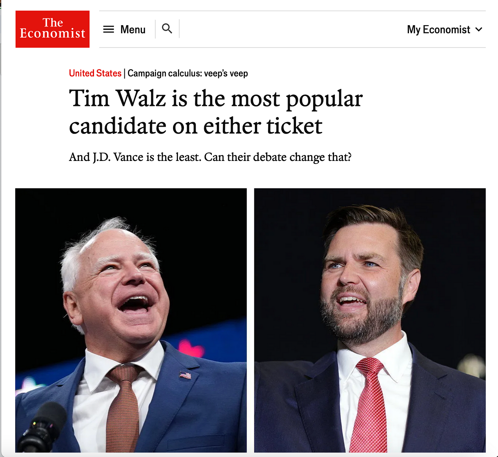 Despite the thick black eyeliner and fuschia tie, Vance looked strong on stage and made Walz appear scared. His strategy? He kept his eyes glued to Walz the whole night, while Walz looked down, scribbling notes, and at times, appeared physically strained.